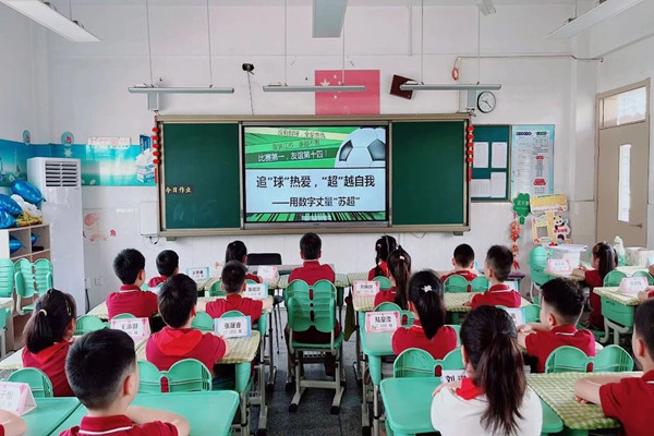 心理课注入“苏超”能量!课上孩子们化身能量规划师,创作“新学期能量图”,将苏超感受到的拼搏活力转化为新学期动力。语文活动同学们聚焦苏超文化,挖掘标语梗,讲述足球故事,为赛事设计口号海报。数学课堂二、三、四年级学生在课堂上解锁球衣“暗号”、争当比分“小裁判”;五、六年级围绕“记分员”“冠军预测家”“进球侦探”展开活动,在趣味活动中巩固数学知识。英语课堂三、四年级学生聚焦江苏城市景点文化,沉浸式感受地域文化风采;五、六年级学生深入探索足球术语与球队吉祥物知识,在足球文化中体悟团队精神的力量。科学组低中年级分享足球体验、探究运动原理;五至六年级聚焦力学,开展实验并展示成果。音乐课上同学们欣赏苏超精彩,“以歌为媒”学唱常州教师原创歌曲,燃爆课堂。美术组一、二年级画进球瞬间,童趣盎然;三、四年级设计融合非遗与城市符号的冰箱贴;五、六年级以海报宣传“苏超”,展现足球文化与本土情怀融合。体育课二至四年级聚焦“苏超小射手”射门比赛,五至六年级则上演“苏超迷你对抗赛”,球员们在绿茵场上奋勇拼抢。