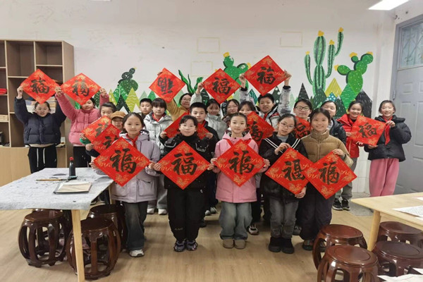 社团活动室里,暖意与墨香交织相伴。大红春联纸整齐铺展,浓黑墨汁馨香萦绕,同学们端坐案前、握笔凝神,沉浸式投入到挥毫创作中,一笔一画皆是认真。笔墨落尽,福气启程。社团博览会现场,书法社团的同学们化身可爱的“送福小使者”,手捧亲手创作的作品,送到家长、同学、老师手中,让新春的喜庆气息,早早飘满了整个校园。